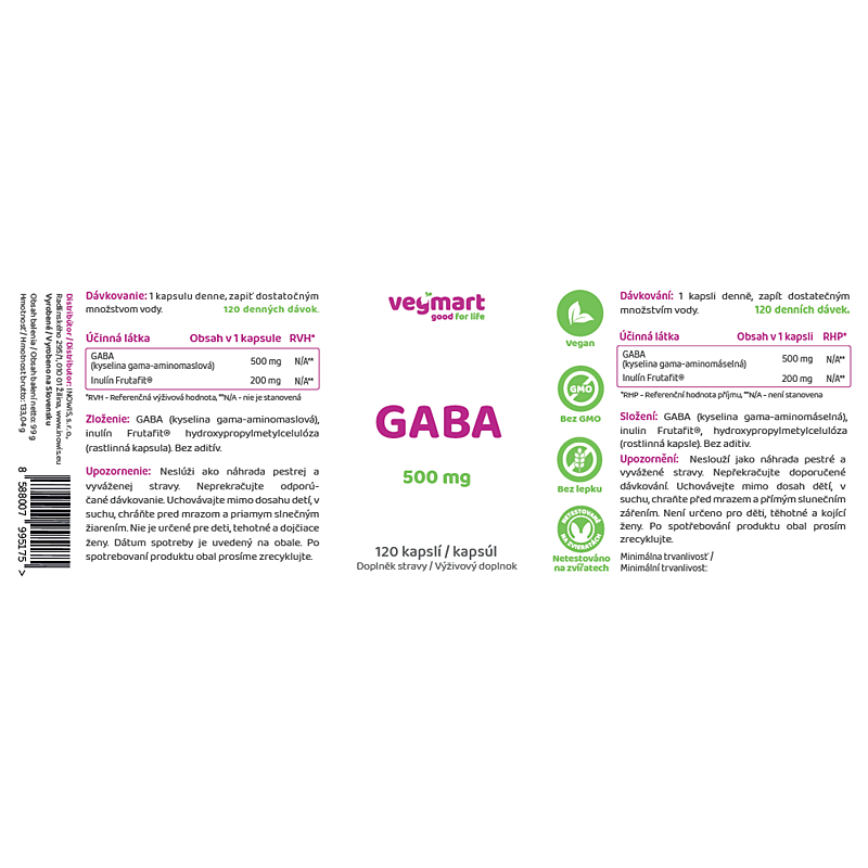Vegmart GABA 500 mg, 120 kapsúl je výživový doplnok z portfólia našej značky Vegmart. Ponúkame vám čisté, 100% vegánske doplnky výživy z kvalitných surovín a vysokým obsahom účinných látok, bez zbytočných aditív. Vegmart - good for life.
