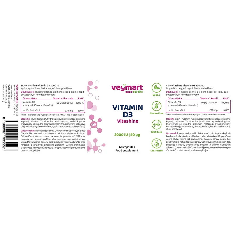 Vitashine Vitamín D3 2000 IU, 60 kapsúl je výživový doplnok z portfólia našej značky Vegmart. Ponúkame vám čisté, 100% vegánske doplnky výživy z kvalitných surovín a s vysokým obsahom účinných látok, bez zbytočných aditív. Vegmart – good for life.